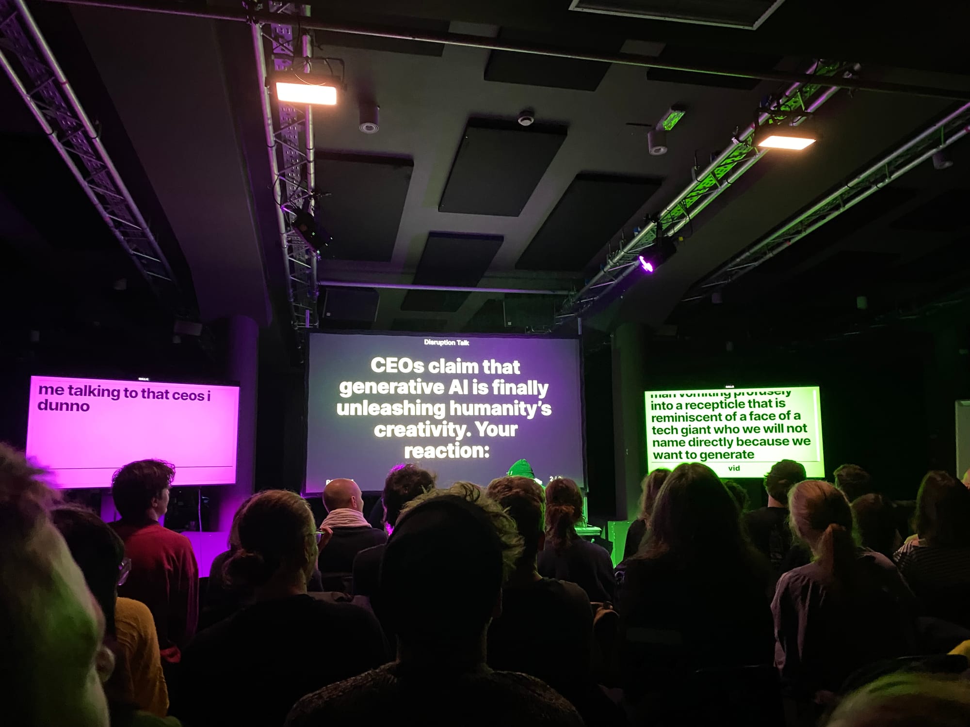 I was anticipating the worst and went a.) to get out of the house after not doing that for three months and b.) curiosity. Because it sounded so annoying and I was happily wrong. It was AI prompting, but fun. You know fun. Like the opposite of reading this newsletter. Anyhow, it was a game show really and worked roughly like a freestyle rap battle where each contestant had to via crowd whooping and hollering voting win for the best prompted AI generated image. Fun. Finally, someone is doing something fun with this stuff.